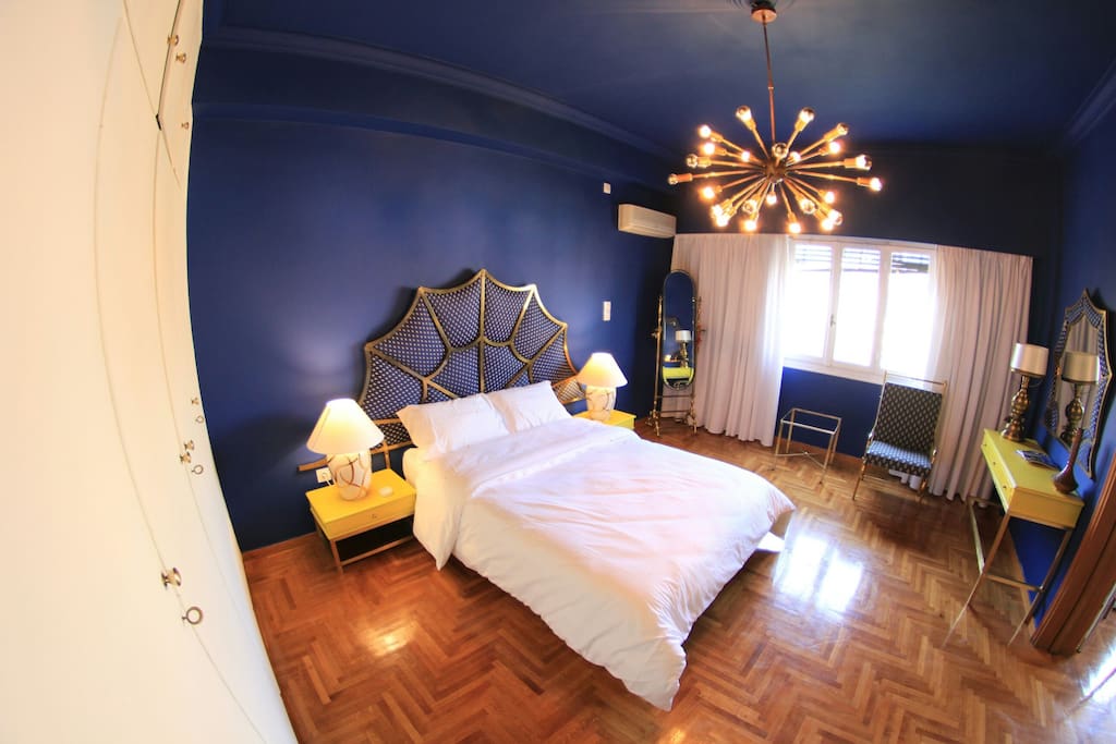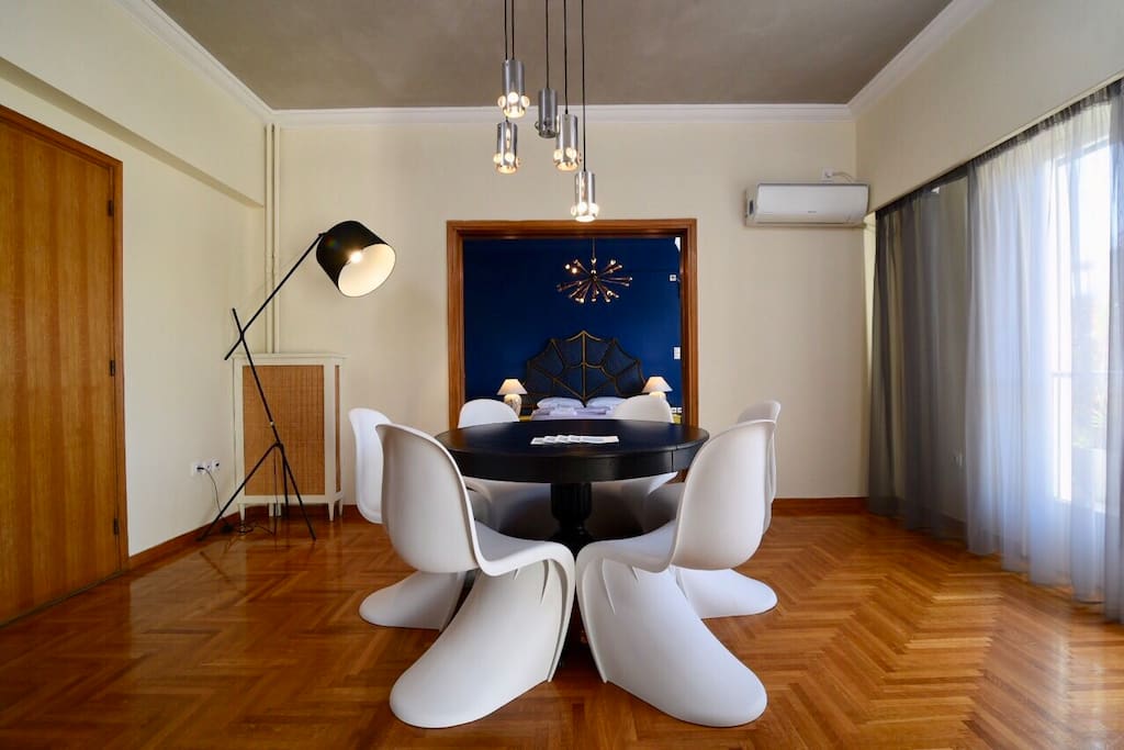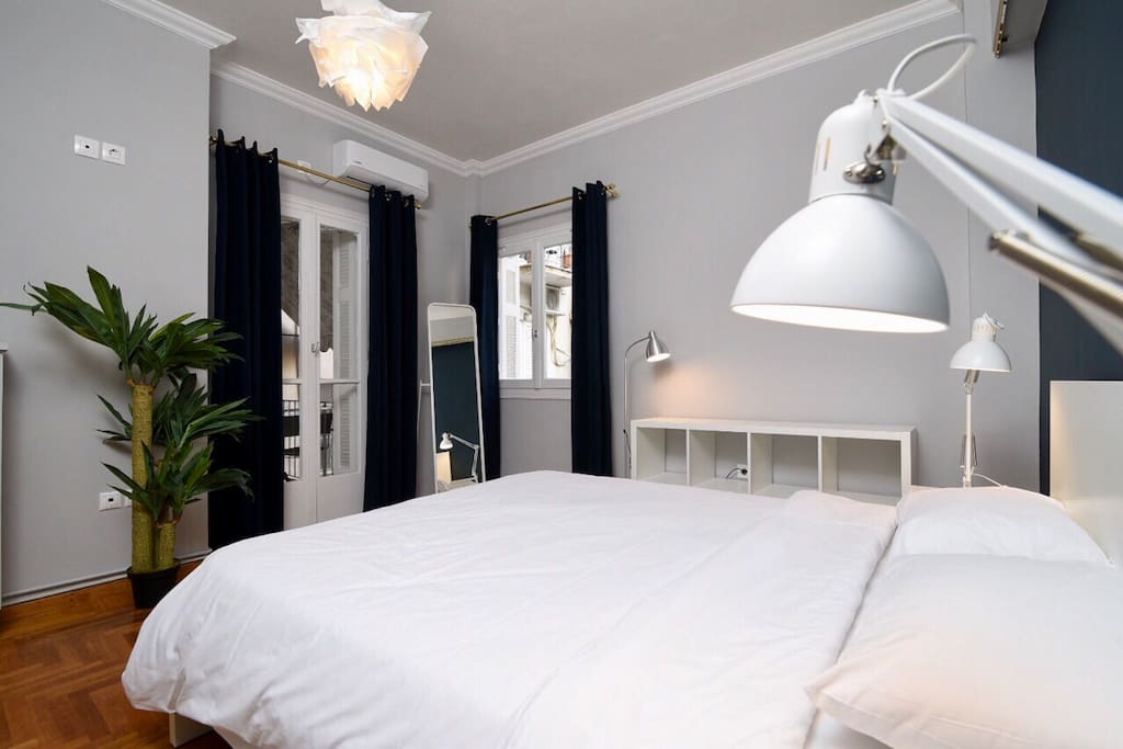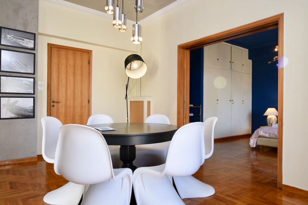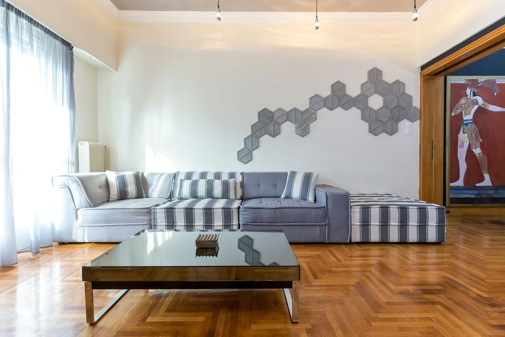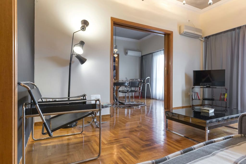 152m² Mid-century modern apartment in Athens with balcony and modern classic design. It is fully equipped and furnished. Located above the famous Patision Street of Athens and easy access to all means of transport. Close to coffee shops, supermarkets and banks.