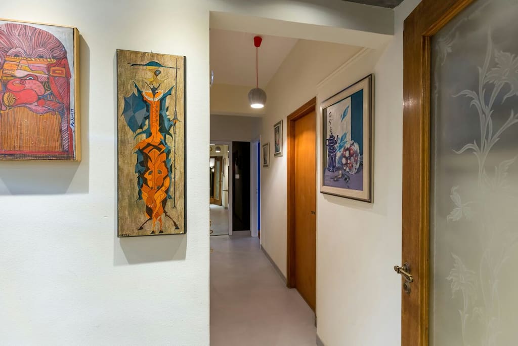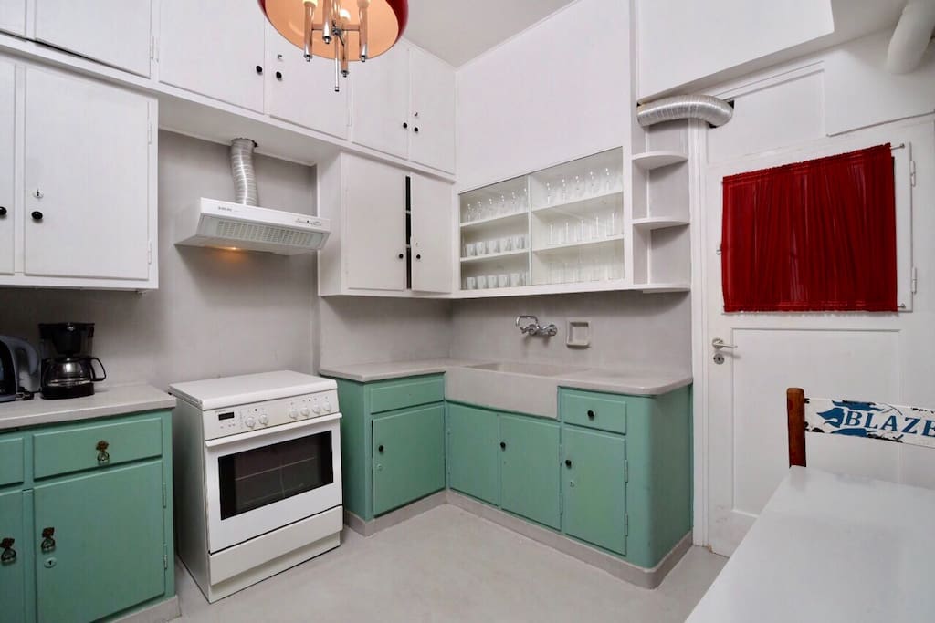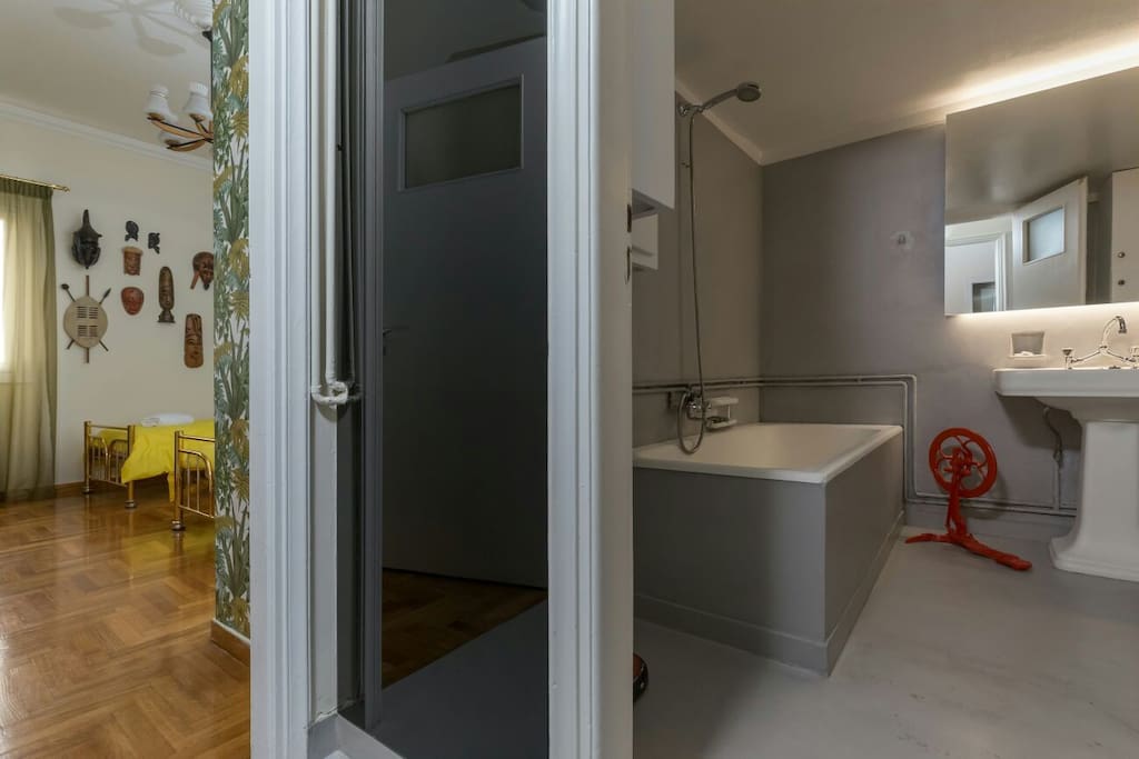 The apartment is really spacious and value for money! It is newly renovated and fully equipped with all necessary appliances and amenities for a luxury stay. Cement mortar kitchen, bathroom, corridor and the two balconies, as well as the ceiling. The furniture and ornamental (like ceiling lights, table lamp, chairs etc.) are retro of 50’s 60’s 70’s and most of them were bought from abroad, while some of them were bought from the coo vintage shop. The house consists of 3 bedrooms of different design and a bathroom and a wc. The living room can also accommodate one person.